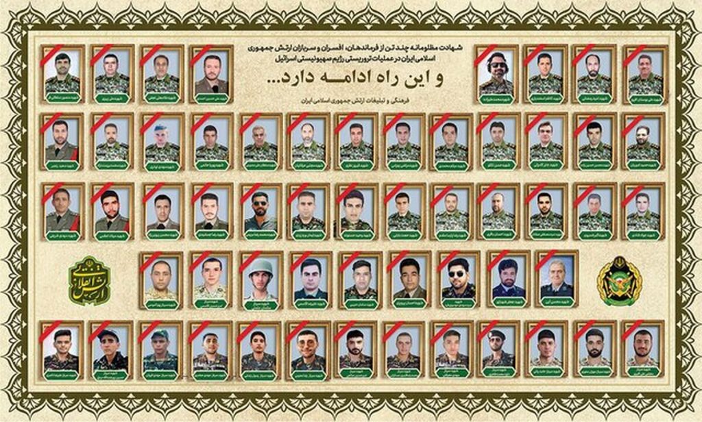 به گزارش صدای شهر به گزارش خبرگزاری برنا به نقل از روابط عمومی ارتش، ۵۶ تن از کارکنان جان برکف ارتش جمهوری اسلامی ایران در راه دفاع از کشور و امنیت مردم قدر شناس ایران اسلامی در تقابل با رژیم صهیونسیتی، به فیض شهادت رسیدند.